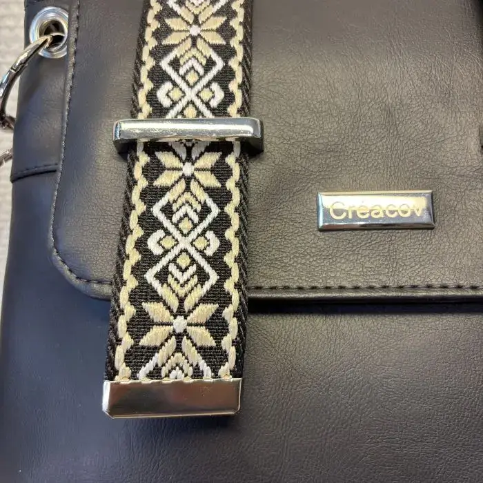 Deux sangles décoratives tissées noir et beige.